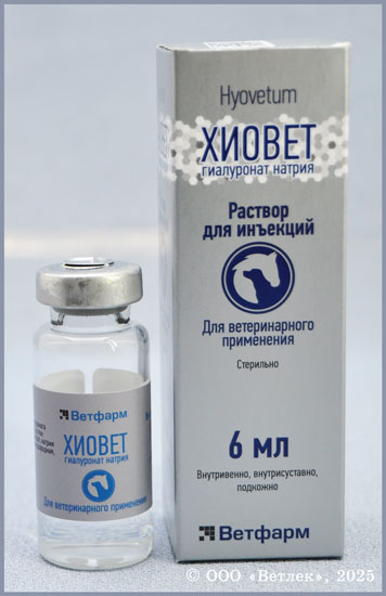 Ветеринарный препарат Хиовет в 1 мл содержит 10,0 мг гиалуроната натрия в натриево-фосфатном буфере.