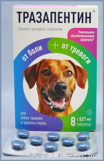 Тразапентин таблетки для собак средних и крупных пород (масса таблетки 527 мг) – 200 мг габапентина и 50 мг сукцината тразодона на таблетку.