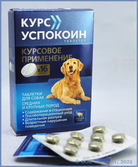 Курс Успокоин таблетки для собак средних и крупных пород (масса таблетки 612 мг) – 140 мг сукцината тразодона на таблетку.
